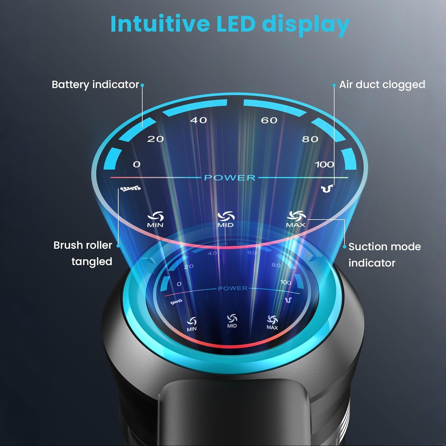 【Intelligent LED display and 5-stage high-performance filtration】The intelligent display shows the battery status, dust bin level, brush blockage, and suction mode in real time, allowing you to monitor the cleaning progress. The upright vacuum cleaner features a five-cone dust and air separation system that effectively captures 99.9% of fine dust particles and releases purified air.